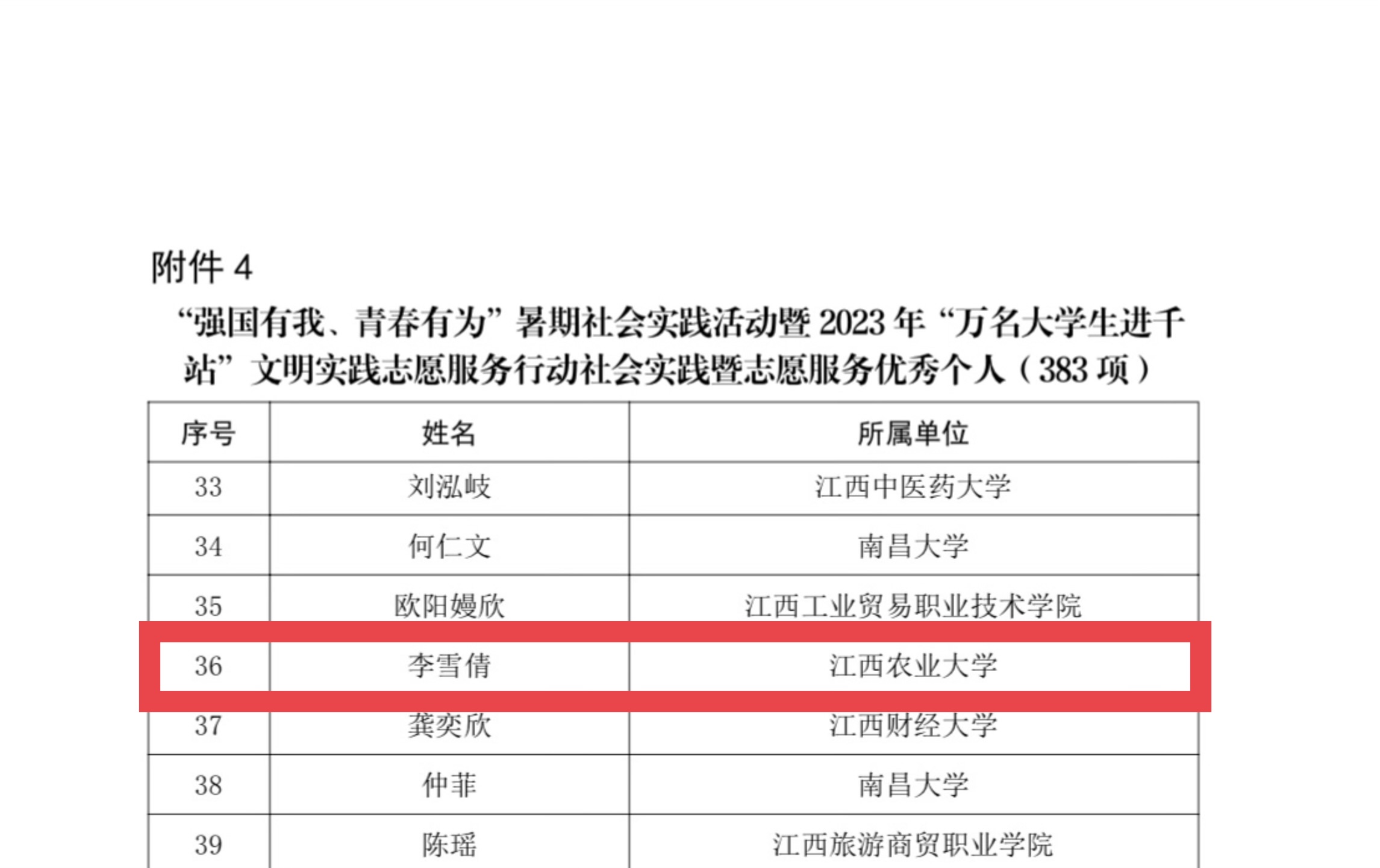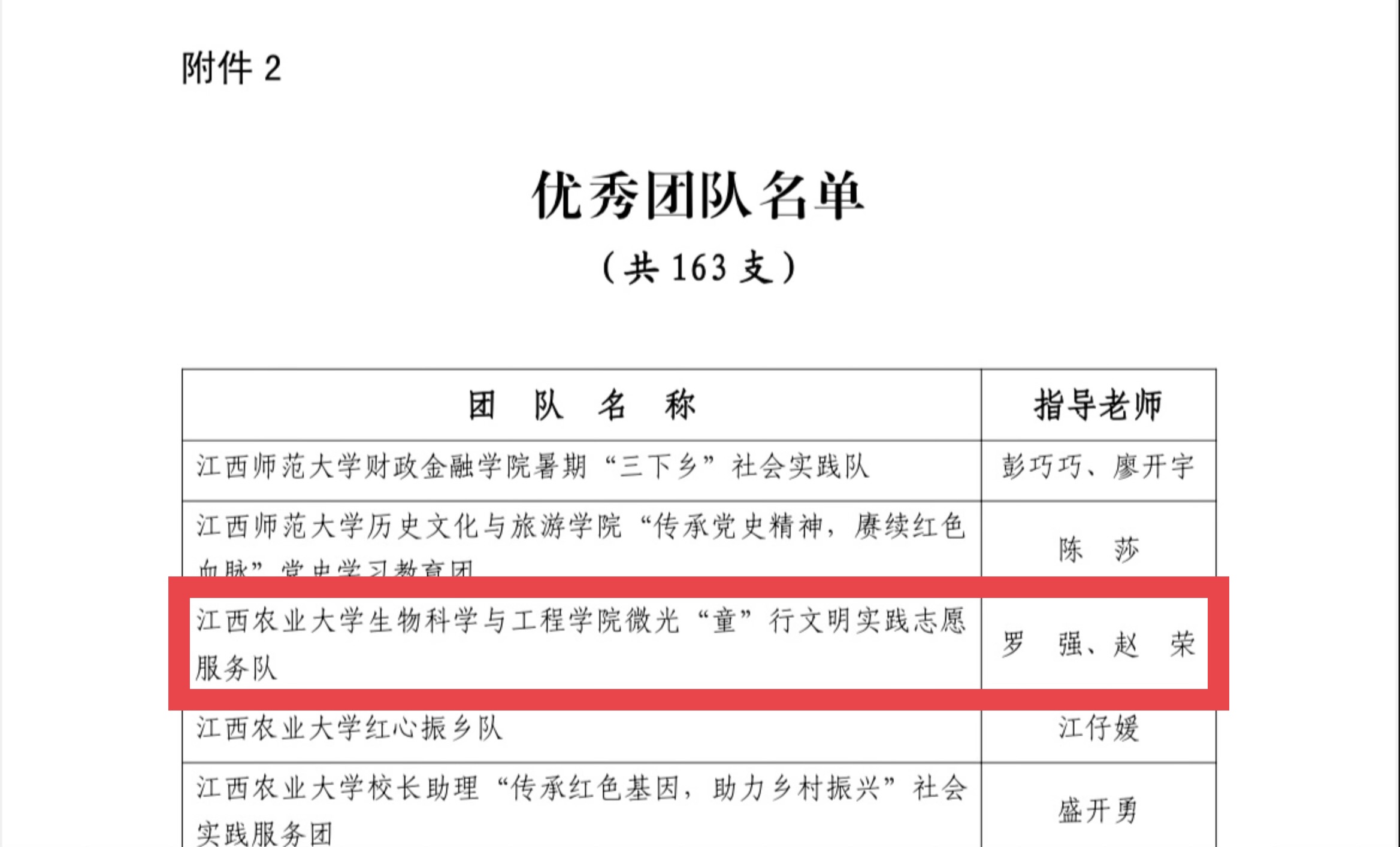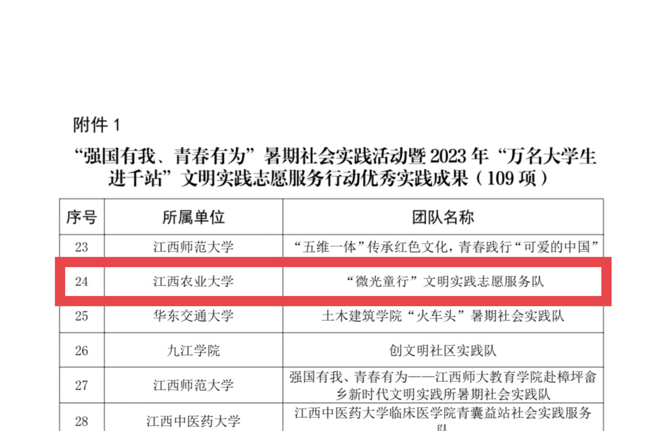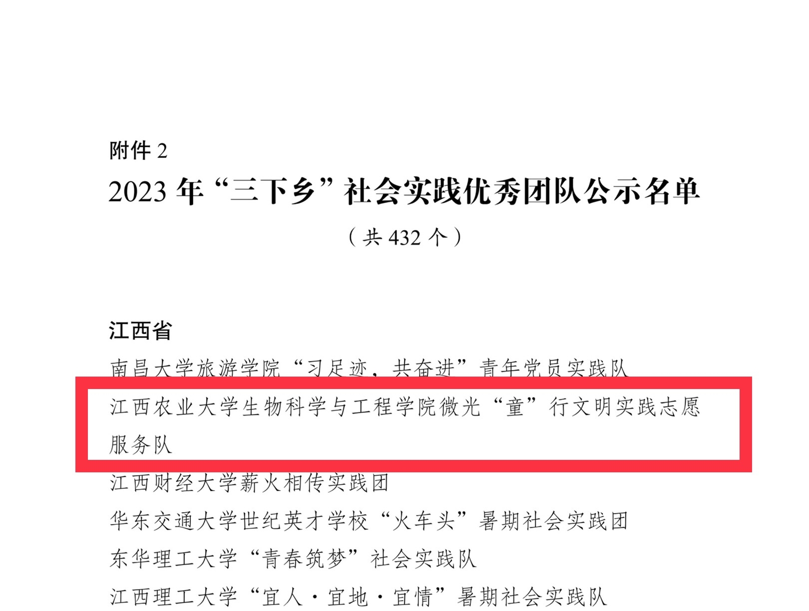 近日,公司“微光‘童’行文明实践志愿服务队”在2023年“三下乡”社会实践活动中脱颖而出喜报频传。先后获得2023年全国大中专员工志愿者暑期文化科技卫生“三下乡”社会实践活动优秀团队;江西省教育厅“强国有我、青春有为”暑期社会实践活动暨2023年“万名老员工进千站”文明实践志愿服务行动优秀实践成果、生技2102班李雪倩获得先进个人;2023 年江西省大中专员工志愿者暑期“三下乡”社会实践活动优秀团队。