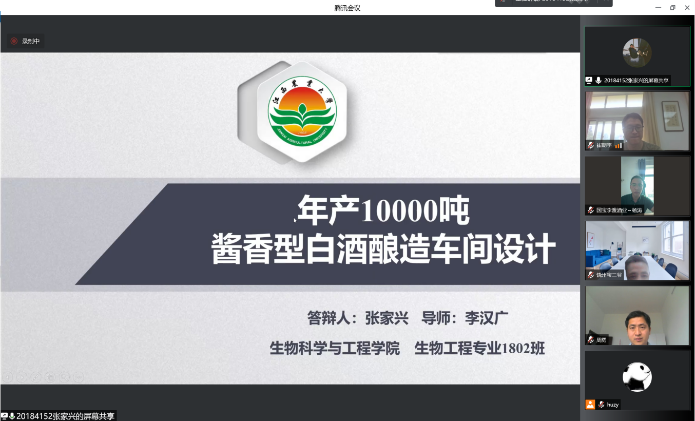 5月9日bevictor伟德2018级本科毕业论文(设计)答辩顺利开展,此次答辩分为8个答辩小组共计307名本科生,其中生物工程专业87人,生物技术专业77人,生物科学专业73人,制药工程专业70人。此次答辩受疫情影响,全部采用线上云答辩,线上答辩过程全程录屏,首先由每位员工进行PPT汇报,随后各答辩老师针对员工的论文(设计)提出问题再由员工作答,针对提出的问题要求员工对毕业论文(设计)进行修改。为了提高工科专业的本科毕业论文(设计)质量,此次答辩特邀请江西李渡酒业有限公司杨涛主任,百威雪津(南昌)啤酒有限公司李云经理等两位校外行业企业兼职教师在线上全程参加了此次答辩,从而进一步确保了员工毕业论文(设计)的答辩质量。
