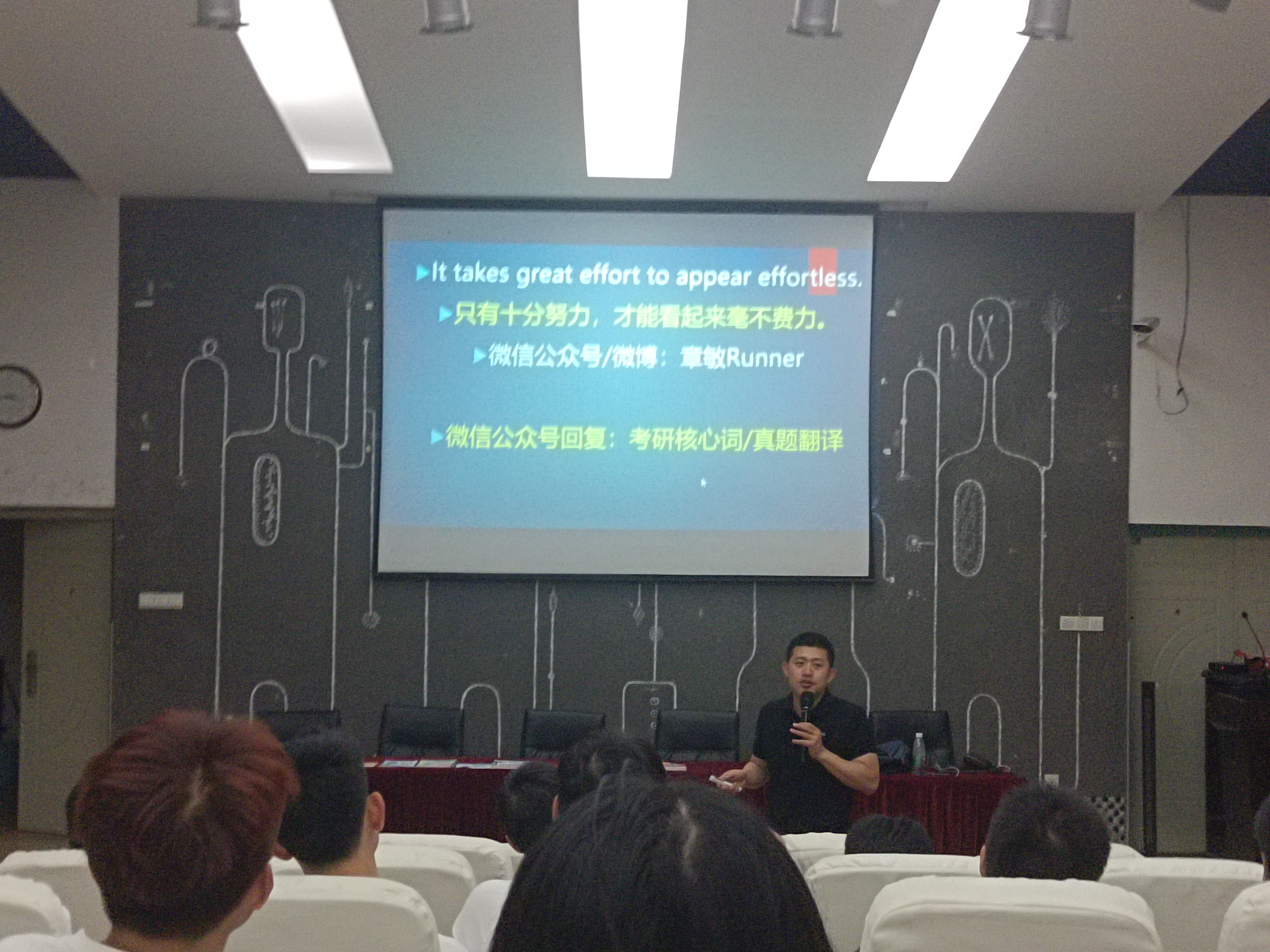 在本次讲座中,章敏老师从近年来考研英语基本情况、考研英语如何复习备考以及考研英语常用资料等方面进行讲解。章敏老师围绕考研英语阅读,从单词和语法等进行分析,并分享了考研英语迅速提高分数的有效方法,让同学们在考研英语学习时避开误区、少走弯路、轻松学习。随后,他具体向同学们讲述了部分考研英语学习技巧,建议大家日常要注重基础英语词汇的积累,在英语学习过程中要注重平常有效练习等。
