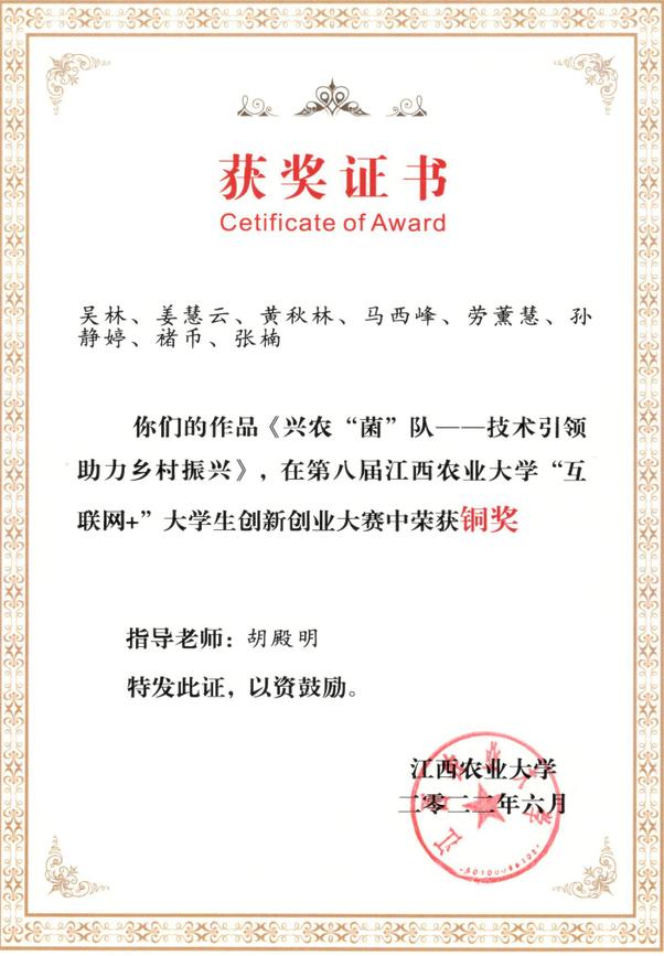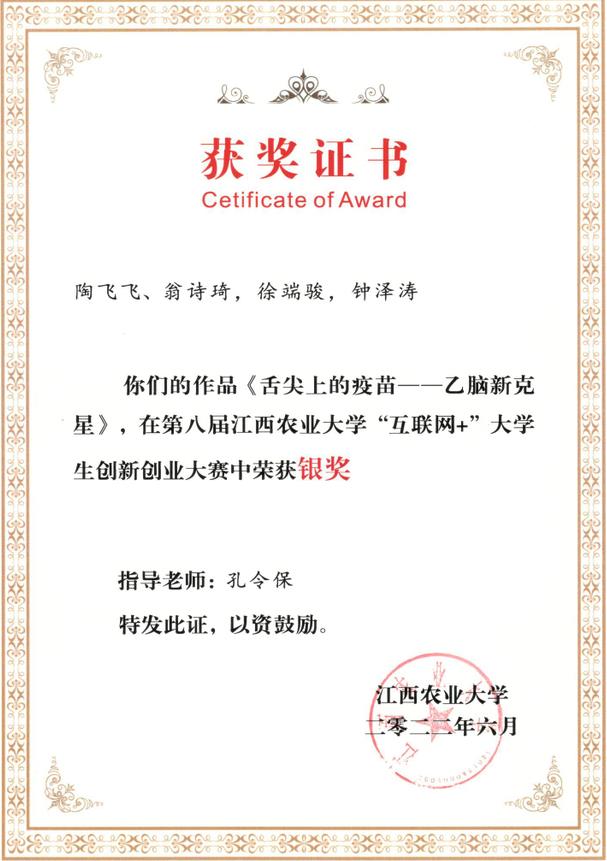 近日,公司公布了《伟德bevictor中文版第八届“互联网+”老员工创新创业大赛获奖名单》,公司在此次比赛中荣获优秀组织奖,公司推荐的参赛项目《舌尖上的疫苗——乙脑新克星》(指导老师:孔令保、王宇)荣获高教主赛道银奖、《兴农“菌”队——技术引领助力乡村振兴》(指导老师:胡殿明)荣获青年红色筑梦之旅赛道铜奖。