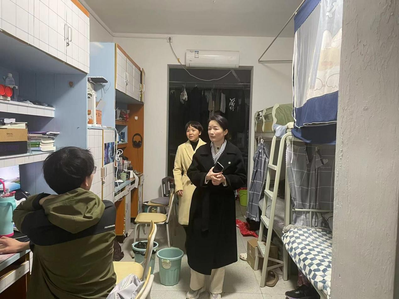 随后,一行来到南区员工宿舍看望了员工,关心了解了同学们的宿舍生活现状,同时对宿舍设施、卫生、消防以及周边电动车停放等进行了详细了解,并向同学们强调了电动车充电等各类安全注意事项,嘱咐大家养成良好的文明行为,共同营造良好学习生活环境。
