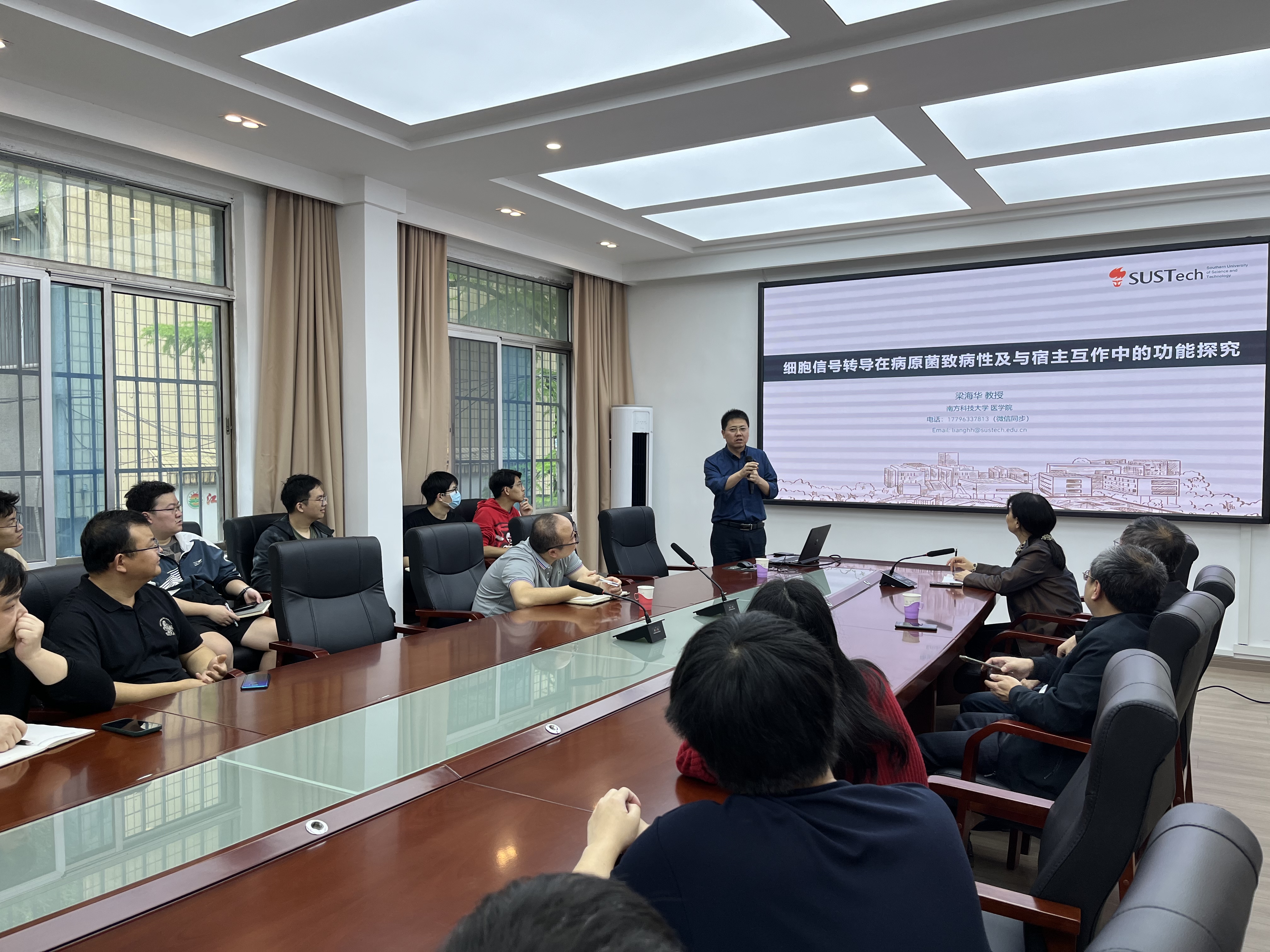 报告中,梁海华详细介绍了他们团队在病原菌致病性及与宿主互作领域的研究成果和思路,并与在场的师生进行了深入的交流和讨论,现场师生纷纷表示受益匪浅,是一场知识的盛宴。梁海华也通过自己的研究经历和实践经验,向大家展示了科学研究的魅力和挑战,并鼓励在场的师生积极投身科学研究事业,为人类健康事业做出更大的贡献。