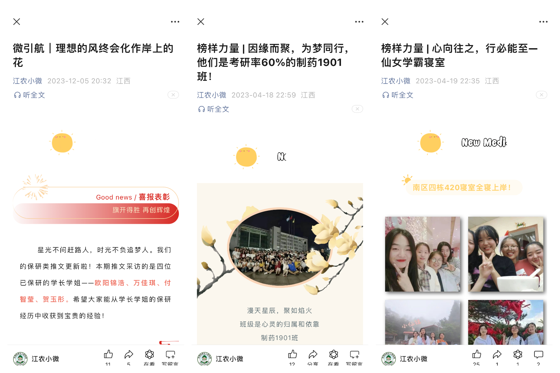 加强宣传,营造以考促学氛围。公司依托“江农小微”微信公众号,整理发布考研相关咨询,为员工提供信息获取渠道。打造“微榜样”专栏,定期推送优秀学长学姐考研经验分享,营造浓厚的考研氛围。
