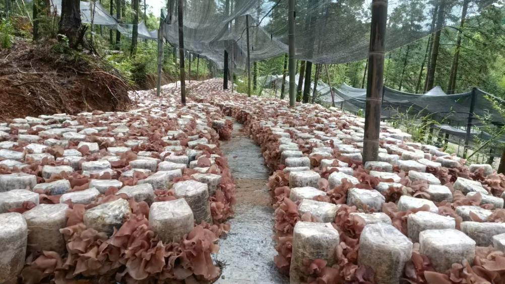 6月下旬,几场雨后,江西抚州利财食用菌有限公司的林下菇场内,整齐摆放的菌袋上,新一茬木耳正在出菇。
