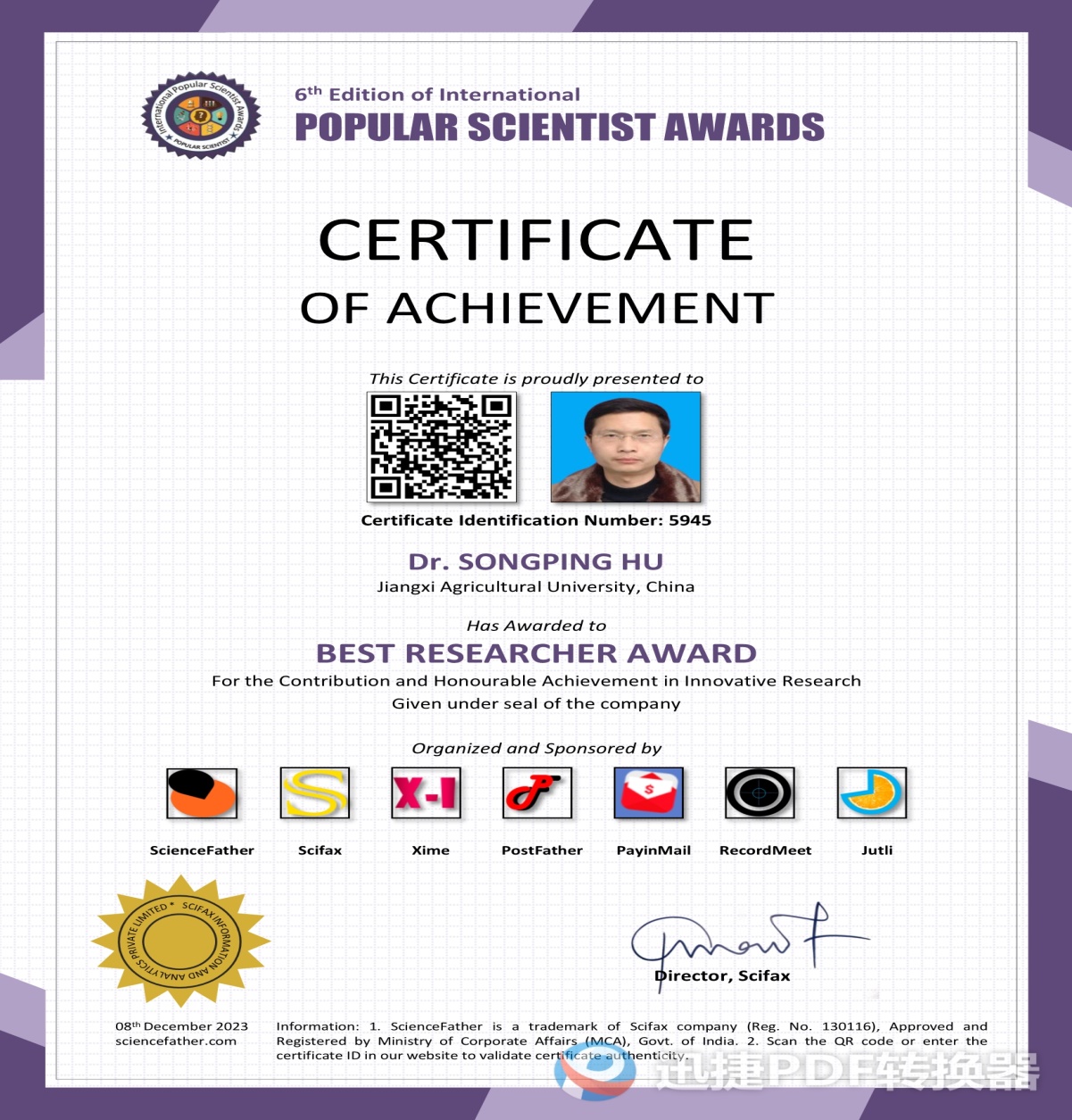 胡颂平教授在植物抗性机理与育种研究方面取得重要进展。经过国际同行专家提名,评委会审查胡颂平老师2014年以来所发论文,其中有17篇与水稻的抗旱性、抗穗腐病、百合抗茎腐病、拟南芥免疫抗性等有关,特别是2020年被引次数达104次,获得国际学术组织ScienceFather授予的2023年“最佳研究者奖”( Best Researcher Award)。据悉,该奖项主要授予在创新研究方面作出贡献和取得成就的学者。