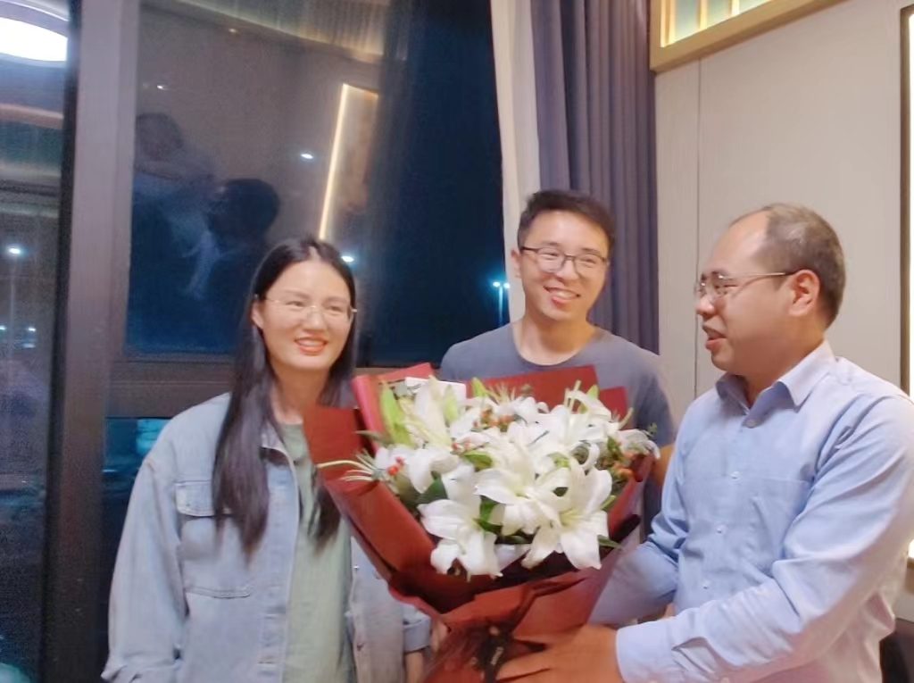 母校蜜月续良缘:运动会期间,生工1402班毛贵东、黎亿爱二位员工重返母校度蜜月,一方面为了给员工们加油,一方面二人一起漫步校园,回忆曾经大学的美好点滴。2014年,二人在美丽农大相识,随后相知、相爱、相伴和一起成长,近日刚举行婚礼,是班级里第一对喜结连理的班对,是大公司园美好爱情的亲历人,是校服走向婚纱的实践者。蜜月期间,二位员工专门从武汉重返母校,见老师和同学,亲自送上喜糖,还前往现场给员工组比赛加油,这是公司员工铭记师恩、珍惜同窗情谊的真实体现,是员工感怀青春、追忆美好时光的内心表达。班主任王飞老师代表班级给二位新人送上了寓意百年好合的鲜花和美好祝福,师生情谊再一次得到了升华。