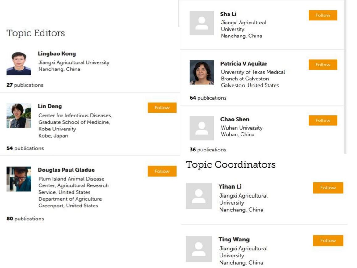 该专题编辑由公司孔令保教授及青年教师李逸寒博士、李莎博士和王婷博士,美国农业部Douglas Paul Gladue博士,美国德克萨斯大学Patricia V Aguilar教授,日本神户大学邓琳教授和武汉大学沈超副教授联合组成,孔令保为编辑组负责人。《Frontiers in Microbiology》是SCI源刊,主要出版微生物领域的最新研究成果及综述论文,目前影响因子为5.64,属于中国科公司文献情报中心期刊分区表二区刊物。