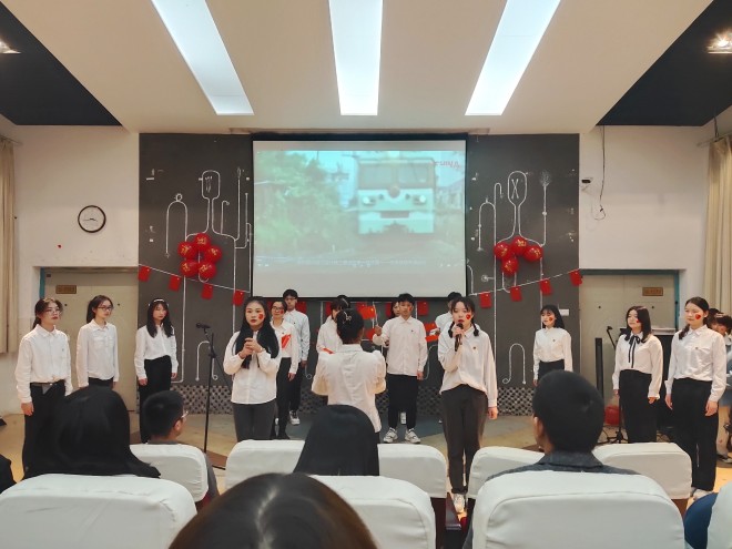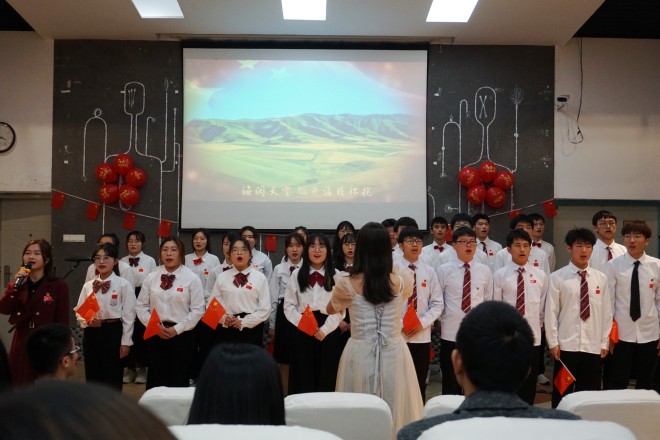 一首振奋人心的合唱——《我和我的祖国》开场,表达了强烈的爱国情怀,与场下观众形成共鸣。紧接着,舞台情景剧《战火中的老员工》为在场的当代青年诠释了身处艰难困苦时期的老员工们具有的艰苦奋斗精神。合唱《国家》和《我们都是追梦人》以整齐嘹亮的歌声与巧妙多样的形式彰显了学子朝气蓬勃、奋发向上的精神面貌。集体朗诵《跨越百年的承诺》将个人梦与中国梦相融合,做出了“爱我中国”的永恒承诺和实现中华民族伟大复兴的不变约定。合唱《同一个少年》以颇具创意的形式进行演绎,诠释了当代青年的共同理想与美好追求。