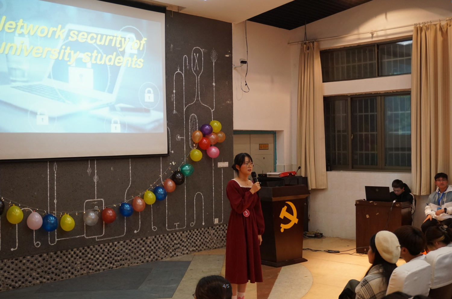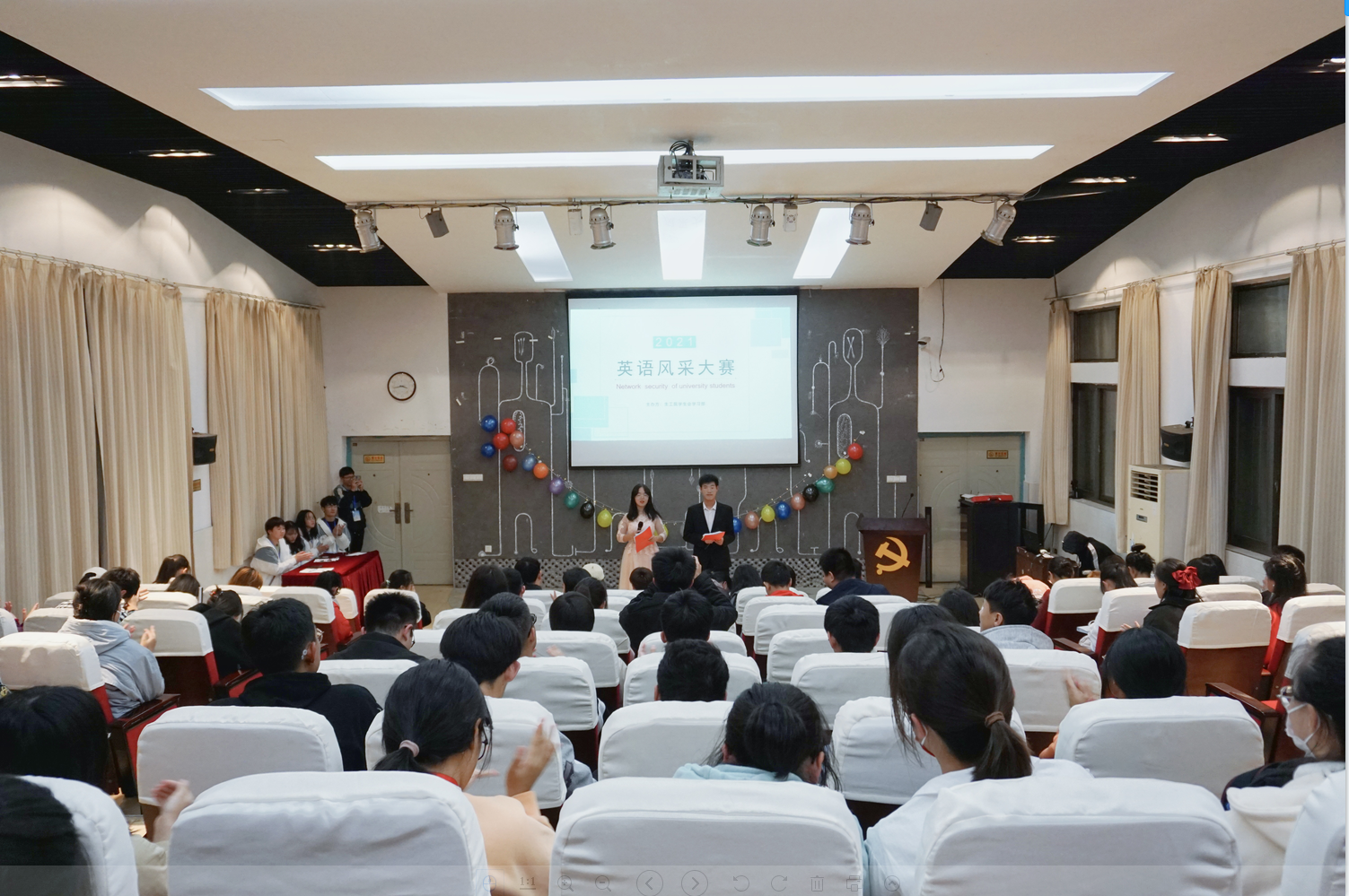 本次大赛共分为英语才艺展示和主题演讲两个环节,各参赛选手们通过英文歌曲演唱、英文朗诵、英文视频配音等多种形式向大家展示自身才艺;围绕“Network security of university students”主题进行演讲,一段段流利的英文演讲向全体观众展示了她们扎实的英文基础,也展现出全体参赛选手临场发挥能力和丰富英文词汇积累量。