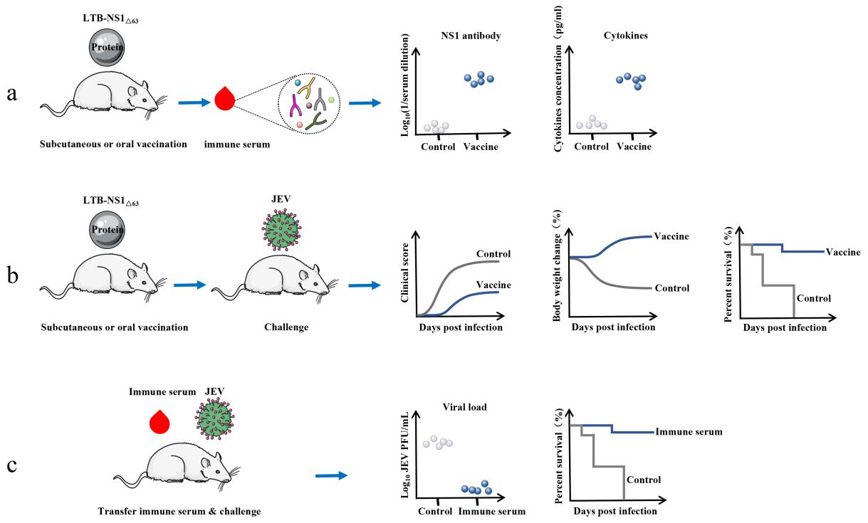 乙型脑炎病毒(JEV)属于黄病毒。是病毒性脑炎的主要原因,是一种严重危害我国人畜健康的传染病,乙脑病毒引起的脑炎导致25-30%死亡率,多达50%的存活患者患有神经或精神后遗症。目前,乙脑病毒疫苗主要有减毒活疫苗和灭活病毒疫苗。减毒活疫苗和灭活病毒疫苗存在返毒、未完全灭活、多次免疫和高成本等缺点。本研究开发的基因工程疫苗LTB-NS1△63具有安全、高效且廉价的优势,具备较好的临床应用前景。除乙脑病毒外,黄病毒中的登革热病毒、寨卡病毒感染也可引起严重疾病。NS1在黄病毒中高度保守,也不会诱导抗体依赖增强作用。 因此,本研究成果也为研发其他重要致病黄病毒的基因工程疫苗提供了新思路。