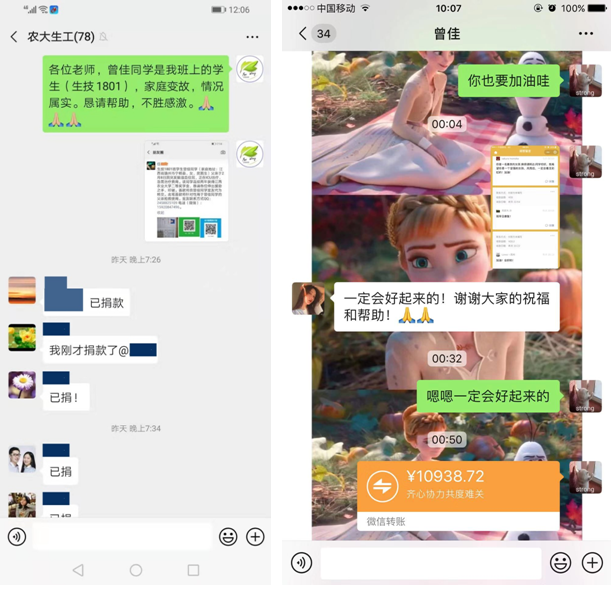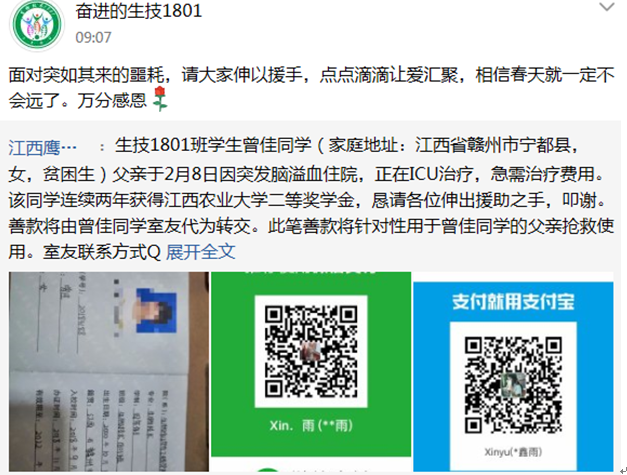 疫情的天空是灰色的,生工师生的心是火红的。2月10日下午,员工班主任王飞老师及时获取了员工的求助信息,并立即反馈给公司主要领导,大家意见一致,共同号召全院师生自愿捐款,奉献爱心。一时间,公司广大老师以及生技1801的同学们立刻发起了为曾佳同学募捐的行动,随后,公司其他班级积极响应,踊跃捐款。点点滴滴当汇涌泉,截止到2月11日下午,仅仅一天时间公司已捐款2万余元,并在班主任的监督下悉数捐给曾佳本人。