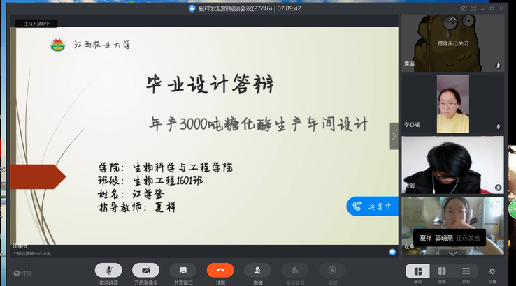 4月28日,生工院组织对4个专业291名本科毕业生以“云答辩”的方式开展毕业论文答辩工作。遵照公司疫情防控办的相关规定,严格执行公司教务处关于疫情期间本着“停课不停教,停课不停学”的原则开展线上教学相关文件精神开展教学活动。本次毕业论文答辩采用PPT演示、线上视频交流的方式进行,将生物工程、生物技术、生物科学和制药工程4个专业的291名本科毕业生,分为7个答辩组。答辩评委成员由各专业专任教师组成。公司要求参加答辩的评委老师以及教学管理人员,采取必要的防护措施,保持座位间隔一定距离,公司专门购置了消毒液,免洗消毒凝胶和医用口罩等,并先行对7个答辩场所进行清扫消毒,开窗通风。评委老师通过视频与同学进行提问和点评,并对同学论文提出修改意见。答辩秘书认真做好记录,答辩评委根据公司制定的答辩评分标准对同学毕业论文进行综合评分。答辩全部结束后,评委老师普遍反映,虽然不是现场答辩,但能感受到同学们在疫情期间对求学态度、对科研的执着精神却有增无减,同学们都能不折不扣地完成学业任务,更加珍惜与老师学习交流的机会。