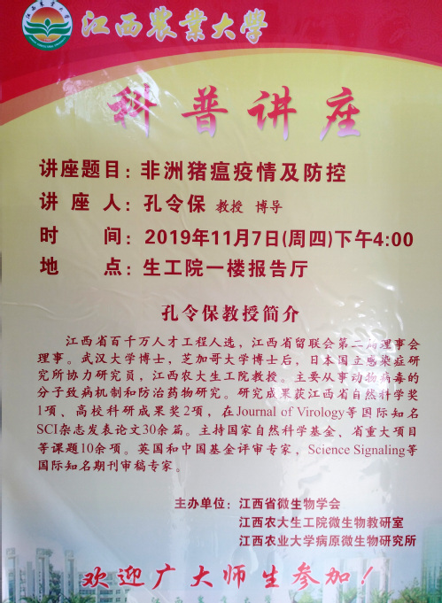 11月7-8日bevictor伟德针对近期关乎国计民生的社会热点事件,与江西省微生物学会、伟德bevictor中文版病原微生物研究所联合举办两场专题科普讲座:第一场:“非洲猪瘟疫情及防控”;第二场:“一只蚊子引发的血案——登革热”。主讲人深入浅出、生动形象地介绍了近期关于非洲猪瘟和登革热发生的根源、现状,以及政府部门、相关科研机构采取的防控措施和解决方案。相关专业的本科生、研究生,以及部分老师参加了讲座,主讲人还与师生进行了现场交流,解答了师生的提问。