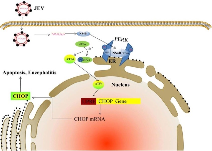 乙型脑炎(乙脑)是由乙脑病毒引起的一种严重危害我国人畜健康的传染病,其突出病理特征是脑组织炎症和细胞死亡。目前乙脑病毒感染致病的确切机制并不清楚,尚无有效的治疗药物。在生工院辛秀、王婷等青年教师的悉心指导下,硕士研究生王骞若通过分子水平、细胞水平和动物水平的系列实验首次发现乙脑病毒通过其编码的非结构蛋白NS4B与两分子PERK分子相互作用,诱导PERK二聚化和激活,进而激活凋亡相关的PERK-ATF4-CHOP信号通路,最终引起脑细胞凋亡和脑炎。该研究首次发现乙脑病毒通过激活PERK信号通路产生致病性,并揭示了其分子机制,为发展相关抗病毒药物提供了新的靶标。