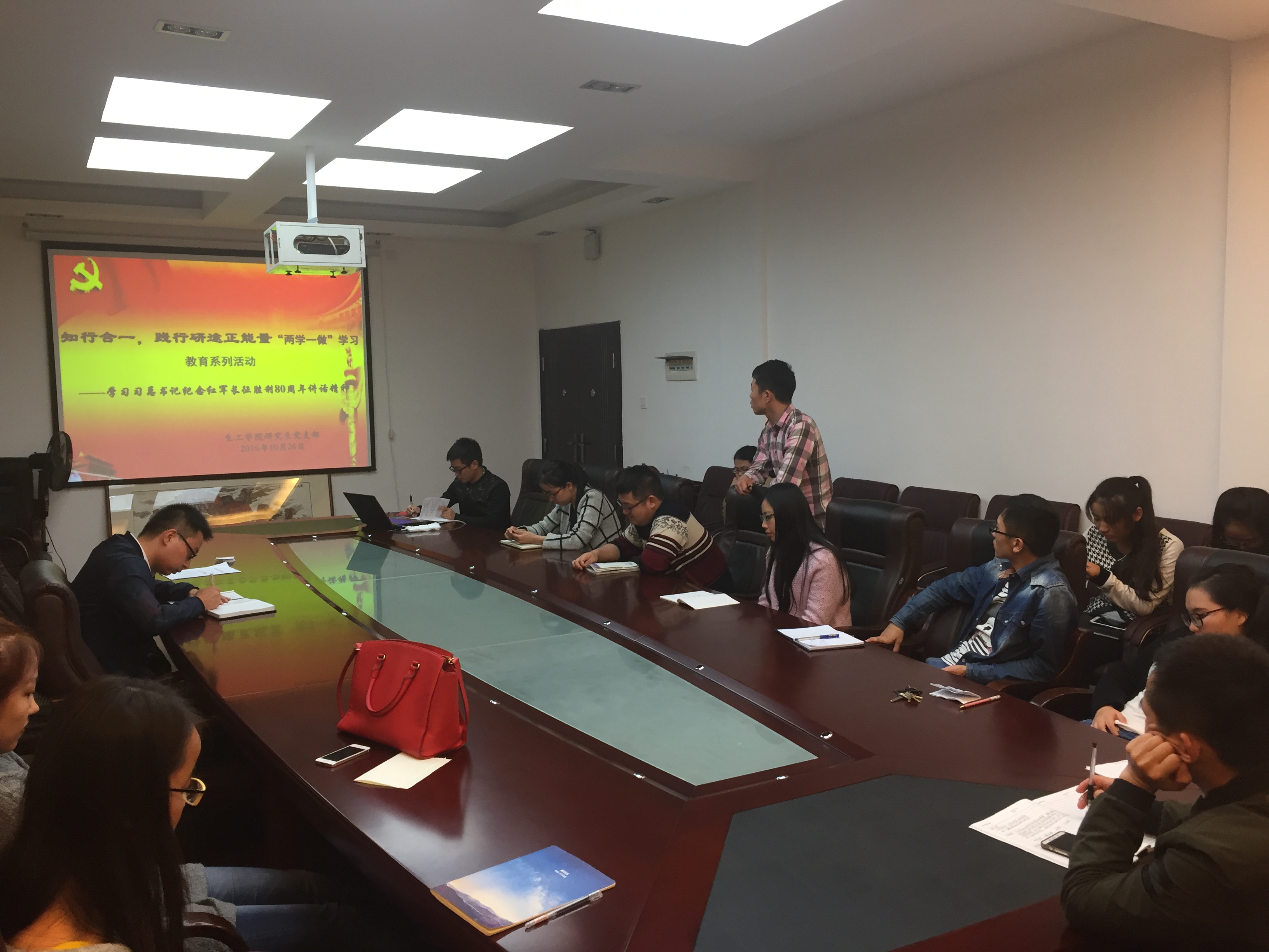 为深入学习贯彻习近平总书记系列重要讲话精神,强化研究生党员纪律意识,大力弘扬长征精神和民族精神,bevictor伟德研究生党支部10月26日18:30于院办二楼会议组织开展了“知行合一,践行研途正能量”两学一做主题学习研讨会。
