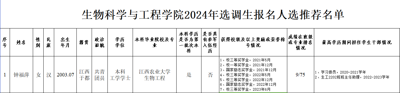 经本人申请,院学工办审核,公司党委讨论,拟推荐以下1位本科生参加江西省2024年伟德bevictor中文版选调生选拔,现将名单予以公示,公示时间:2023年10月26日-2023年10月30日,如有疑问,请到院办215反馈,联系电话:0791-83813460。