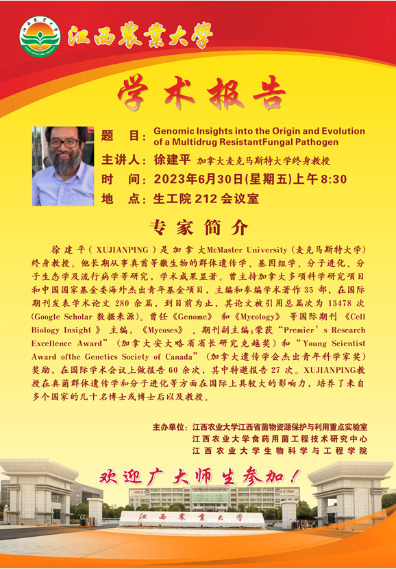 【学术报告】预告:Genomic Insights into the Origin and Evolution of a Multidrug ResistantFungal Pathogen