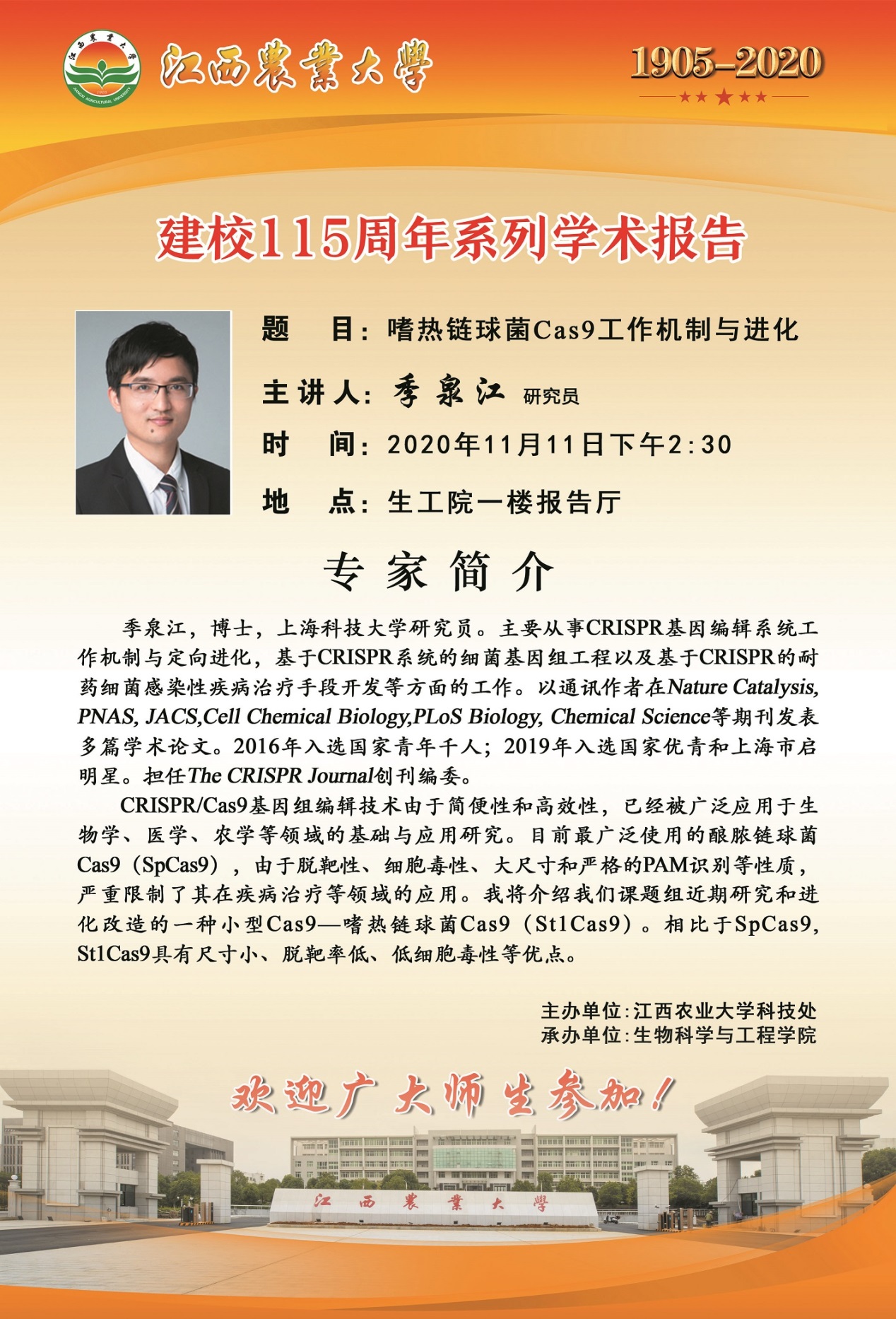 【建校115周年系列学术报告】预告:嗜热链球菌Cas9工作机制与进化
