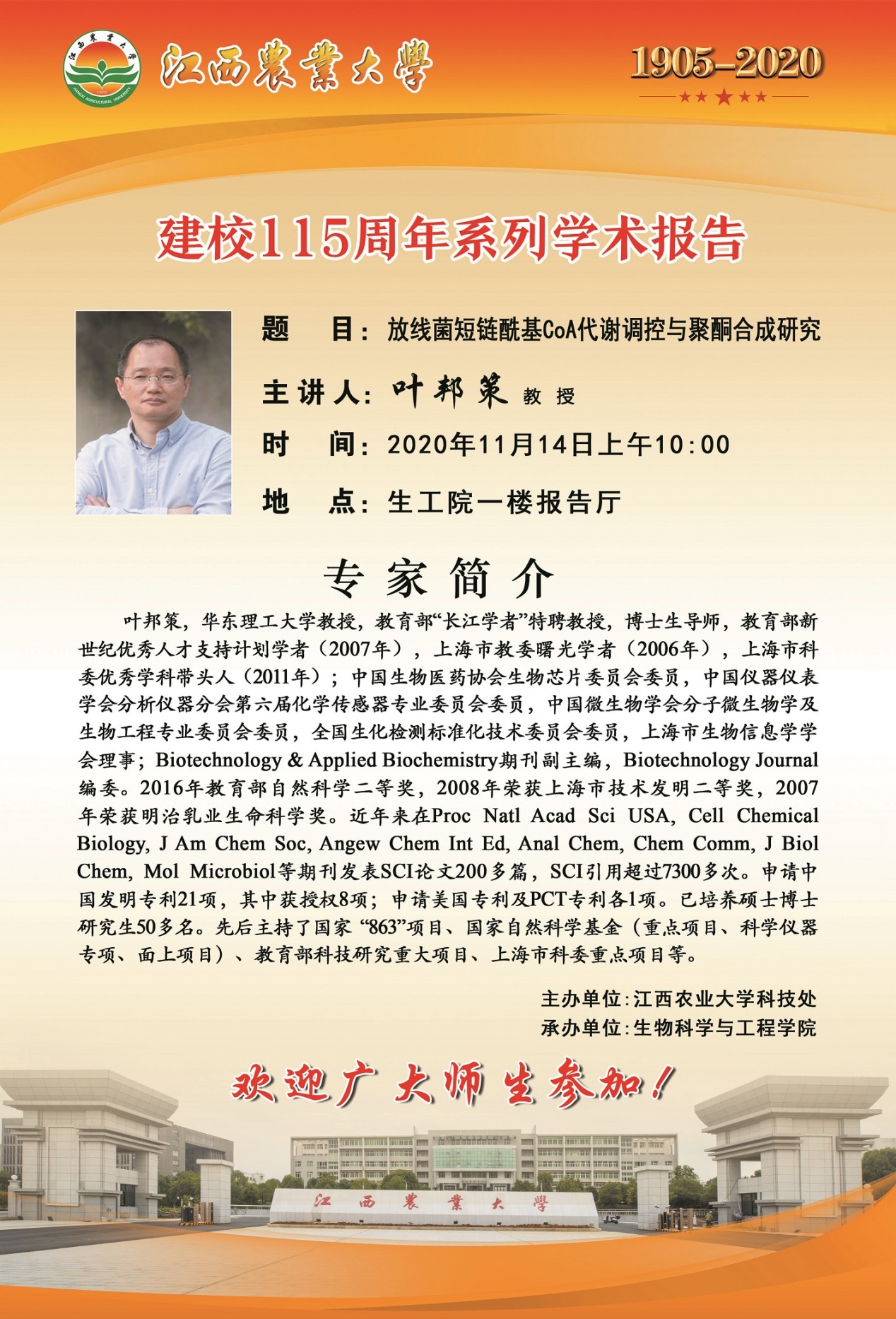 【建校115周年系列学术报告】预告:放线菌短链酰基CoA代谢调控与聚酮合成研究