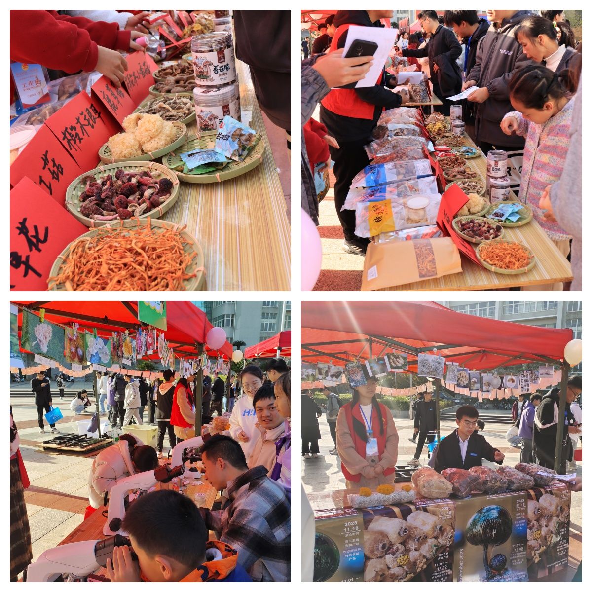 “蘑菇节科技成果展”以实体样品、科技学术成果展览两个部分组成。“菌菇汤、菌菇水饺、猴头菇饼干、蘑菇脆片、虫草压片果糖、灵芝孢子粉” 等试吃食品深受广大师生欢迎,“食用菌盲盒”更是增添了活动现场的趣味性,使参与者在轻松愉快的氛围中了解菌菇知识,通过参观和品鉴原汁、原味、原创农业科技成果,进一步推进科技小院创新成果转化,夯实科技自立自强之基。