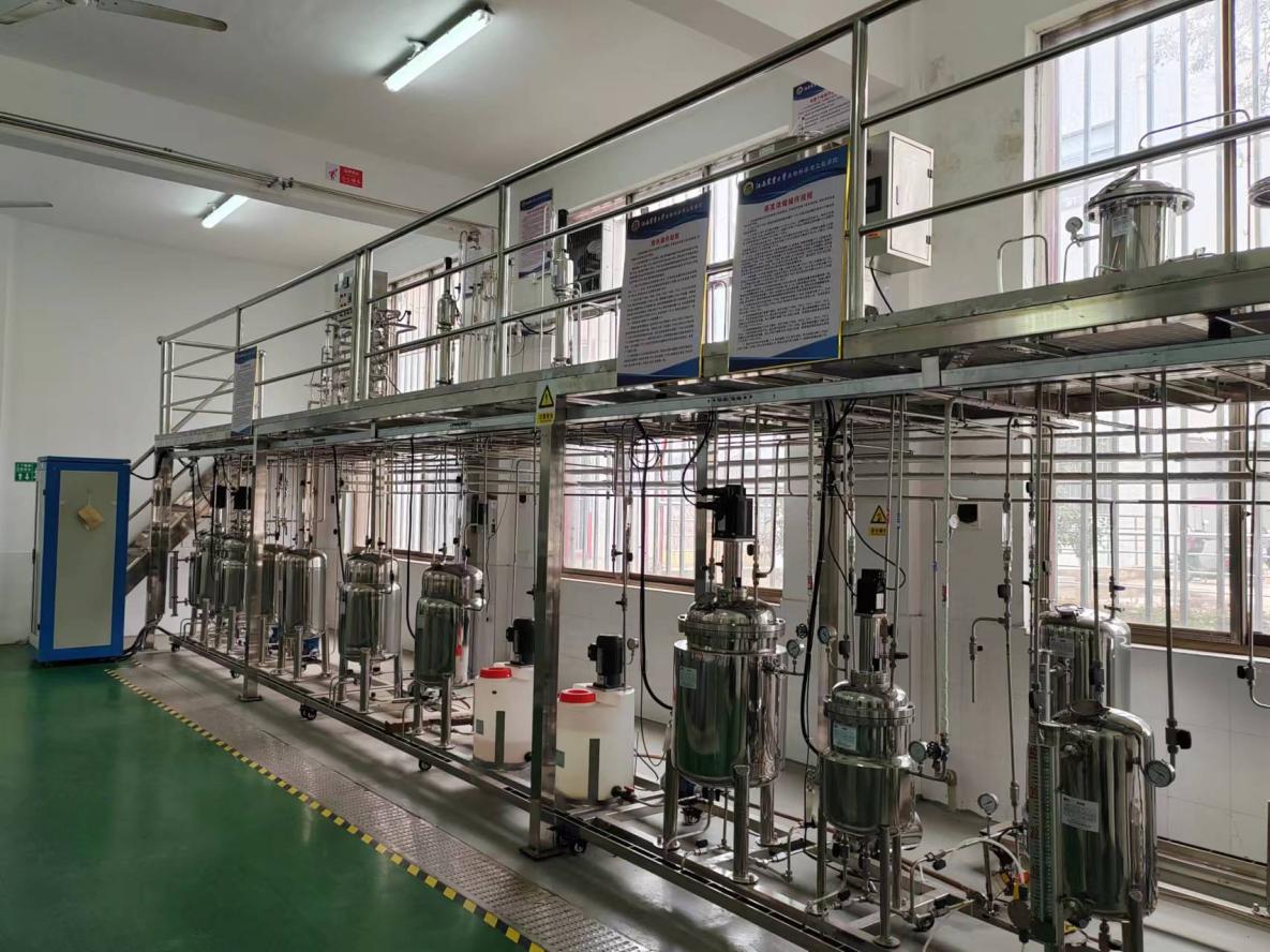 实验中心的生物发酵中试基地是国内高校少有的发酵中试车间,其包含发酵罐中试线和多功能发酵产品提取中试线。发酵罐中试线是由2套全自动不锈钢的15L-50L-500L-1000L发酵罐组成,共8个发酵罐,可单独使用,也可组合使用;还包括压缩空气过滤系统,蒸汽发生器,冷水机等配套设备。多功能发酵产品提取中试线是由常见的分离提取单元组成,包括过滤,超滤,离子交换,脱色,浓缩,结晶,喷雾干燥等,各单元既可单独使用,也可串联使用,完成对发酵产品的提取分离。